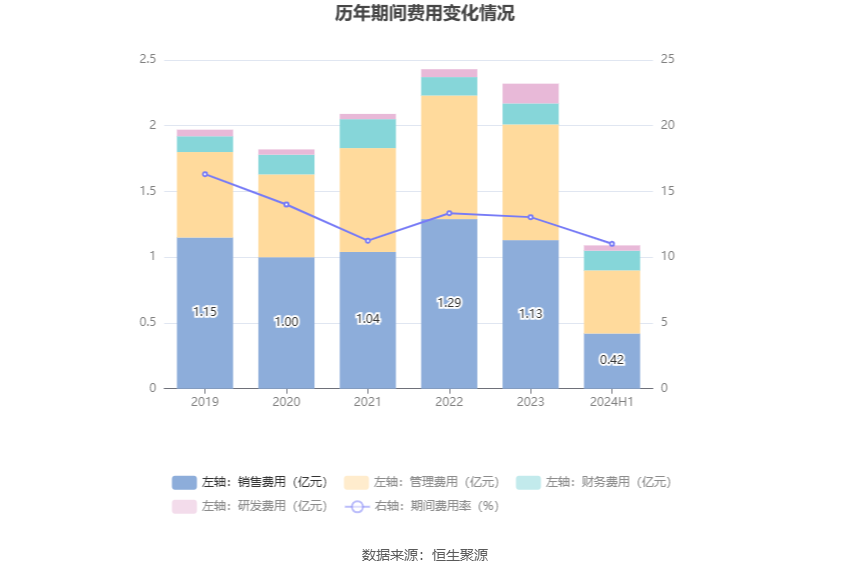 2024年上半年,公司期间费用为1.08亿元,较上年同期增加84.17万元;但期间费用率为11.02%,较上年同期下降1.77个百分点。其中,销售费用同比下降17.39%,管理费用同比增长7.57%,研发费用同比下降48.31%,财务费用同比增长187.72%。