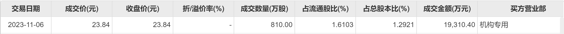 今日大宗交易成交810万股,成交额1.93亿元,占当日总成交额的62.52%,成交价23.84元,较市场收盘价持平。