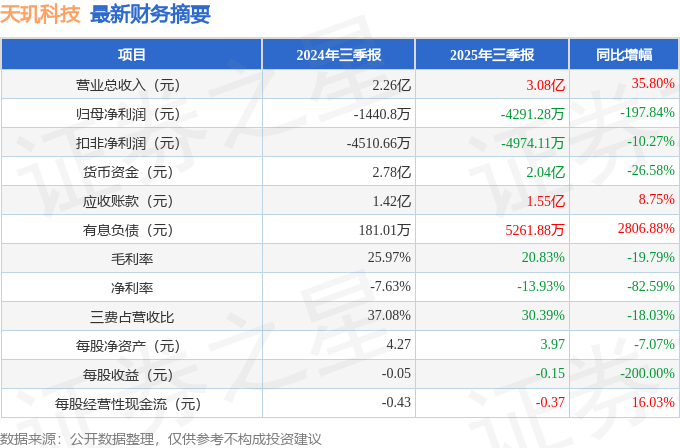 据证券之星公开数据整理,近期天玑科技(300245)发布2025年三季报。根据财报显示,天玑科技增收不增利。截至本报告期末,公司营业总收入3.08亿元,同比上升35.8%,归母净利润-4291.28万元,同比下降197.84%。按单季度数据看,第三季度营业总收入8269.38万元,同比上升8.24%,第三季度归母净利润-880.41万元,同比下降171.52%。