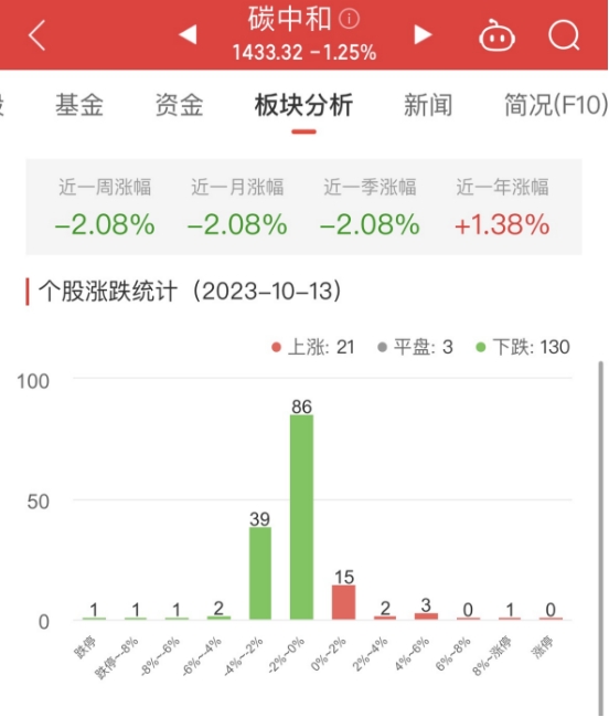 中国经济网北京10月13日讯今日,碳中和板块整体涨幅-1.25%,其中21只股票上涨,3只股票平盘,130只股票下跌。