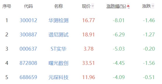 华测检测、谱尼测试、ST实华、曙光数创、元琛科技位列涨幅榜后五位,涨幅分别为-8.01%、-6.29%、-5.03%、-4.45%、-4.09%。