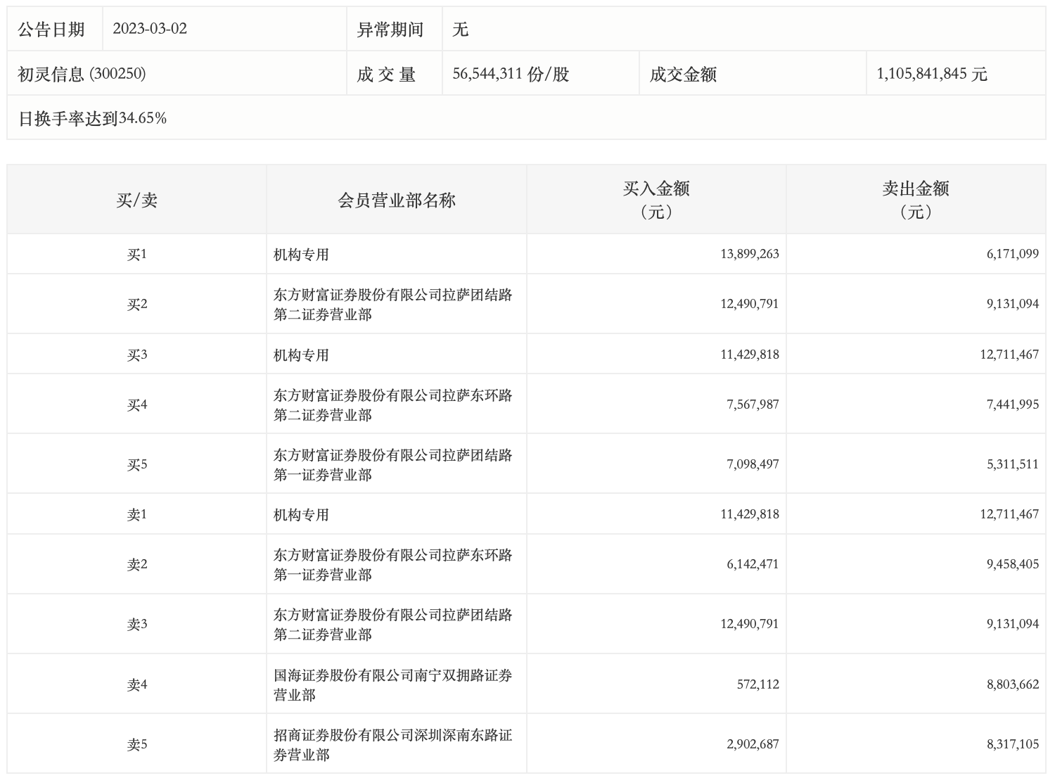 3月2日,初灵信息今日涨7.19%,龙虎榜数据显示,上榜营业部席位全天成交1.29亿元,占当日总成交金额比例为11.71%。其中,买入金额为6210.36万元,卖出金额为6734.63万元,合计净卖出524.27万元。