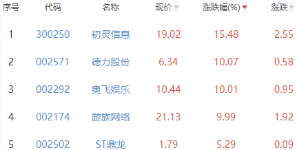 其中,初灵信息、德力股份、奥飞娱乐、游族网络和ST鼎龙位列板块涨幅前五位,涨幅分别为15.48%、10.07%、10.01%、9.99%和5.29%。