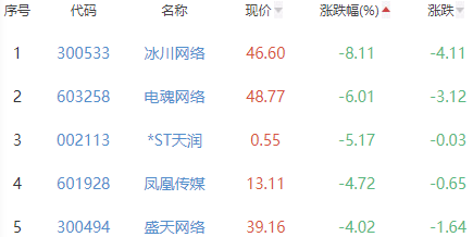 冰川网络、电魂网络、*ST天润、凤凰传媒和盛天网络位列涨幅榜后五位,涨幅分别为-8.11%、-6.01%、-5.17%、-4.72%和-4.02%。