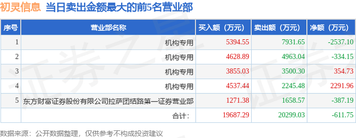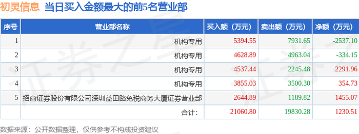 11月19日初灵信息(300250)龙虎榜数据:机构净卖出224.56万元