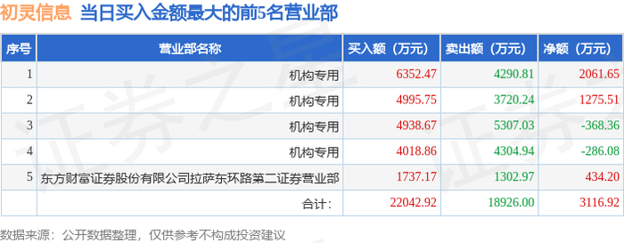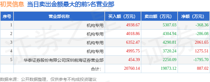 11月20日初灵信息(300250)龙虎榜数据:机构净买入2682.72万元