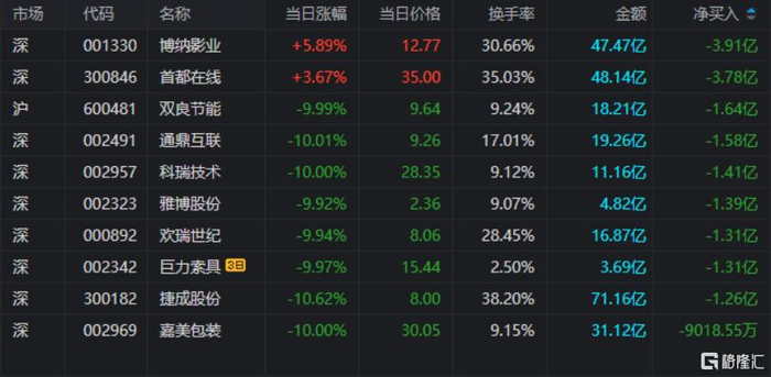龙虎榜单日净卖出额前三为博纳影业、首都在线、双良节能,分别为3.91亿元、3.78亿元、1.64亿元。