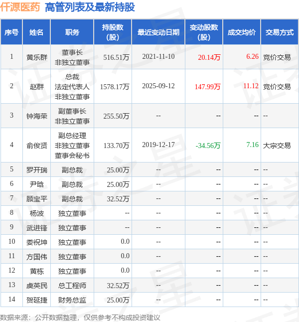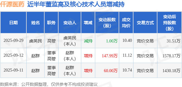 仟源医药近半年内的董监高及核心技术人员增减持详情如下: