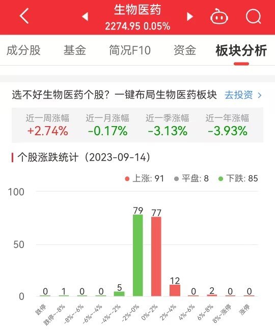 中国经济网北京9月14日讯今日,生物医药板块整体涨幅0.05%,其中91只股票上涨,8只股票平盘,85只股票下跌。