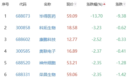 毕得医药、科拓生物、康鹏科技、奥联电子、神州细胞、荣昌生物位列涨幅榜后五位,涨幅分别为-13.70%、-3.23%、-2.52%、-2.37%、-2.35%、-2.35%。