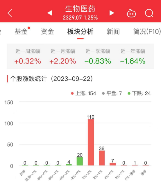 中国经济网北京9月22日讯今日,生物医药板块整体涨幅1.25%,其中154只股票上涨,7只股票平盘,24只股票下跌。