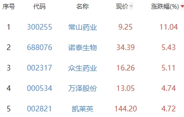 其中,常山药业、诺泰生物、众生药业、万泽股份、凯莱英位列板块涨幅前五位,涨幅分别为11.04%、5.43%、5.11%、4.74%、4.72%。