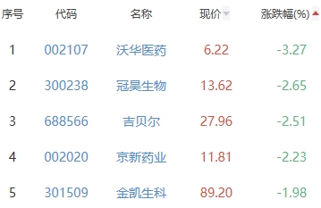 沃华医药、冠昊生物、吉贝尔、京新药业、金凯生科位列涨幅榜后五位,涨幅分别为-3.27%、-2.65%、-2.51%、-2.23%、-1.98%。