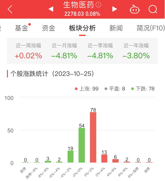 中国经济网北京10月25日讯今日,生物医药板块整体涨幅0.08%,其中99只股票上涨,8只股票平盘,78只股票下跌。