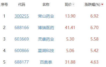 其中,常山药业(维权)、博瑞医药(维权)、灵康药业(维权)、星湖科技、百奥泰位列板块涨幅前五位,涨幅分别为6.92%、6.70%、5.58%、5.42%、4.63%。