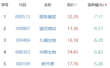 丽珠集团、谱尼测试、九强生物、华熙生物、新开源位列涨幅榜后五位,涨幅分别为-7.11%、-6.57%、-6.20%、-5.83%、-5.28%。
