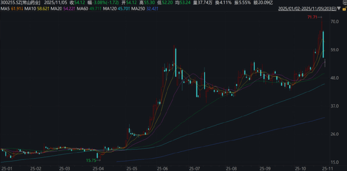 即便期间公司业绩陷入连续亏损,但市场对艾本那肽商业化仍寄予高预期。2025年以来,常山药业股价从最低点13.78元/股(不复权,下同),一路涨至最高点71.71元/股,年内最高涨幅超300%。