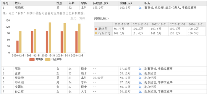 据东方财富网数据,常山药业董事长兼总经理高晓东2024年所获薪酬为100.3万元,副董事长高洁、副总经理孙云霞同年分别领薪37.23万和50.21万元。
