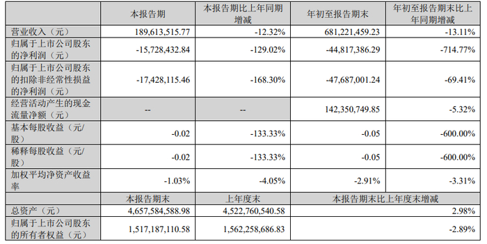 报告显示,常山药业公司前三季度营业收入为6.81亿元,同比下降13.11%;归母净利润为-4481.74万元,同比下降714.77%;扣非归母净利润为-4768.70万元,同比下降69.41%;基本每股收益-0.05元。