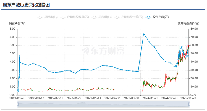 散户的增加更为迅猛。2024年底常山药业股东户数还稳定在3.5万户左右,2025年7月直接飙升至5.8万户,半年新增散户超2万户。机构与散户的竞相涌入,在2025年二季度形成共振——机构借赛道热度抢筹控盘,散户跟风“赌减肥神药上市”,两者共同将常山药业的股价从23元推至71元的历史高位。