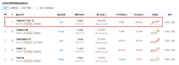 私募排排网信息显示,截至2025年11月,元素基金管理规模约5亿-10亿元,旗下共运行5只基金产品。其中,此次接手常山药业股份的“元素致远行千里一号”成立于2020年,成立5年来累计收益达188%,是基金核心主力产品之一;其余4只产品的累计收益在15%-70%,且这5款产品均属于R5级高风险产品。