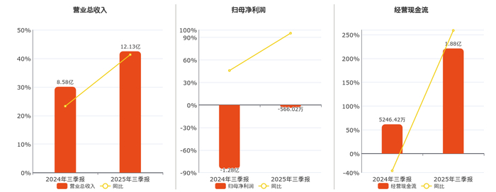 公司营业总收入为12.13亿元。归母净利润为-566.02万元。经营活动现金净流入为1.88亿元。