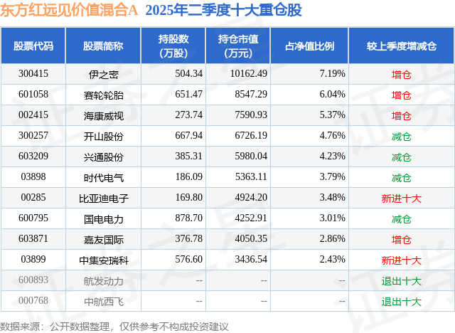 东方红远见价值混合A的前十大重仓股如下:
