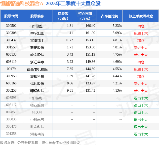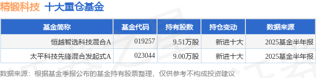 根据2025基金半年报公募基金重仓股数据,重仓该股的公募基金共2家,其中持有数量最多的公募基金为恒越基金的恒越智选科技混合A。恒越智选科技混合A目前规模为0.25亿元,最新净值1.3792(9月19日),较上一交易日下跌3.67%,近一年上涨73.4%。该公募基金现任基金经理为杨藻。
