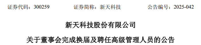 公告显示,新天科技股份有限公司当日召开 2025 年第一次临时股东会,选举产生公司第六届董事会非职工代表董事。该非职工代表董事与 2025 年 12 月 4 日公司职工代表大会选举产生的职工代表董事石林,共同组成公司第六届董事会,公司完成董事会换届选举工作。