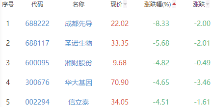 成都先导、圣诺生物、湘财股份、华大基因和信立泰位列涨幅榜后五位,涨幅分别为-8.33%、-5.68%、-4.82%、-4.65%和-4.51%。