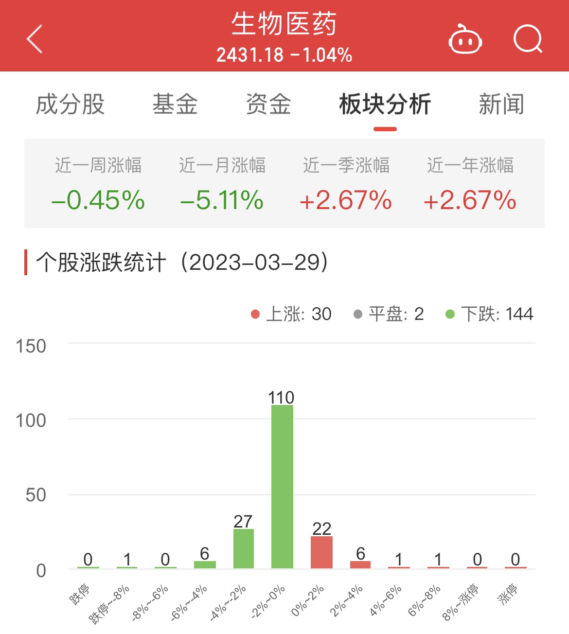 中国经济网北京3月29日讯今日,生物医药板块整体涨幅-1.04%,其中30只股票上涨,2只股票平盘,144只股票下跌。