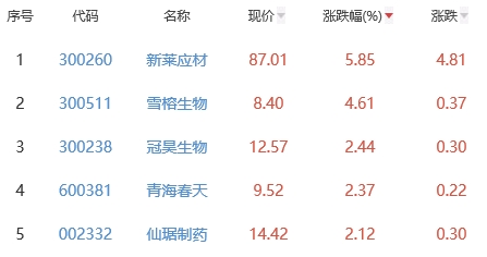 其中,新莱应材、雪榕生物、冠昊生物、青海春天、仙琚制药位列板块涨幅前五位,涨幅分别为5.85%、4.61%、2.44%、2.37%、2.12%。