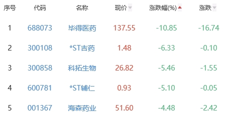 毕得医药、*ST吉药、科拓生物、*ST辅仁、海森药业位列涨幅榜后五位,涨幅分别为-10.85%、-6.33%、-5.46%、-5.10%、-4.48%。