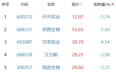 开开实业、荣昌生物、甘李药业、艾力斯、我武生物位列涨幅榜后五位,涨幅分别为-5.74%、-5.43%、-4.54%、-3.98%、-3.37%。