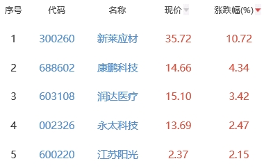 其中,新莱应材、康鹏科技、润达医疗、永太科技、江苏阳光位列板块涨幅前五位,涨幅分别为10.72%、4.34%、3.42%、2.47%、2.15%。