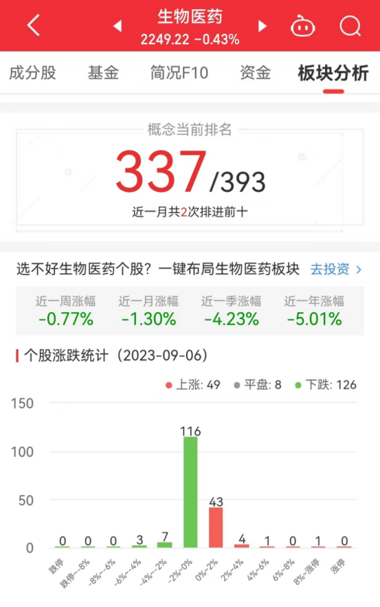 中国经济网北京9月6日讯今日,生物医药板块整体涨幅-0.43%,其中49只股票上涨,8只股票平盘,126只股票下跌。