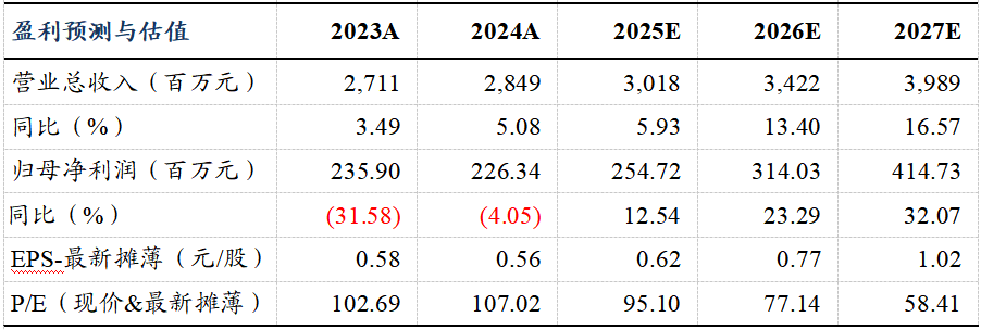 我们维持公司2025-2027年归母净利润预测为2.55/3.14/4.15亿元,当前股价对应动态PE分别为95/77/58倍。基于公司在半导体零部件业务的长期高成长性,维持“增持”评级。