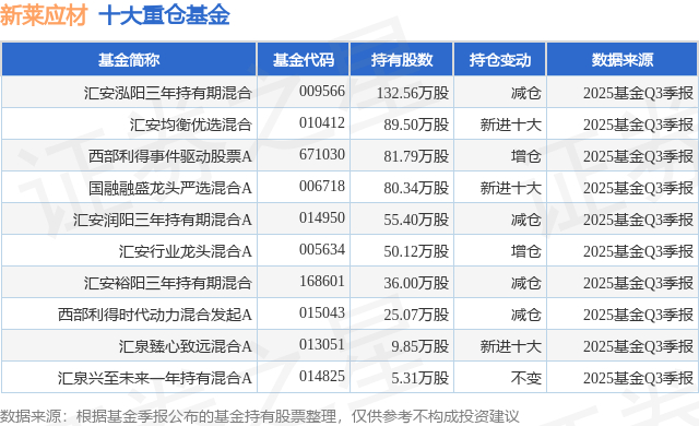 根据2025基金Q3季报公募基金重仓股数据,重仓该股的公募基金共10家,其中持有数量最多的公募基金为汇安基金的汇安泓阳三年持有期混合。汇安泓阳三年持有期混合目前规模为7.58亿元,最新净值1.3606(11月24日),较上一交易日下跌0.24%,近一年上涨36.06%。该公募基金现任基金经理为邹唯。邹唯在任的基金产品包括:汇安裕阳三年持有期混合,管理时间为2018年9月27日至今,期间收益率为133.79%;汇安行业龙头混合A,管理时间为2019年8月28日至今,期间收益率为151.02%;汇安均衡优选混合,管理时间为2021年2月9日至今,期间收益率为14.39%。