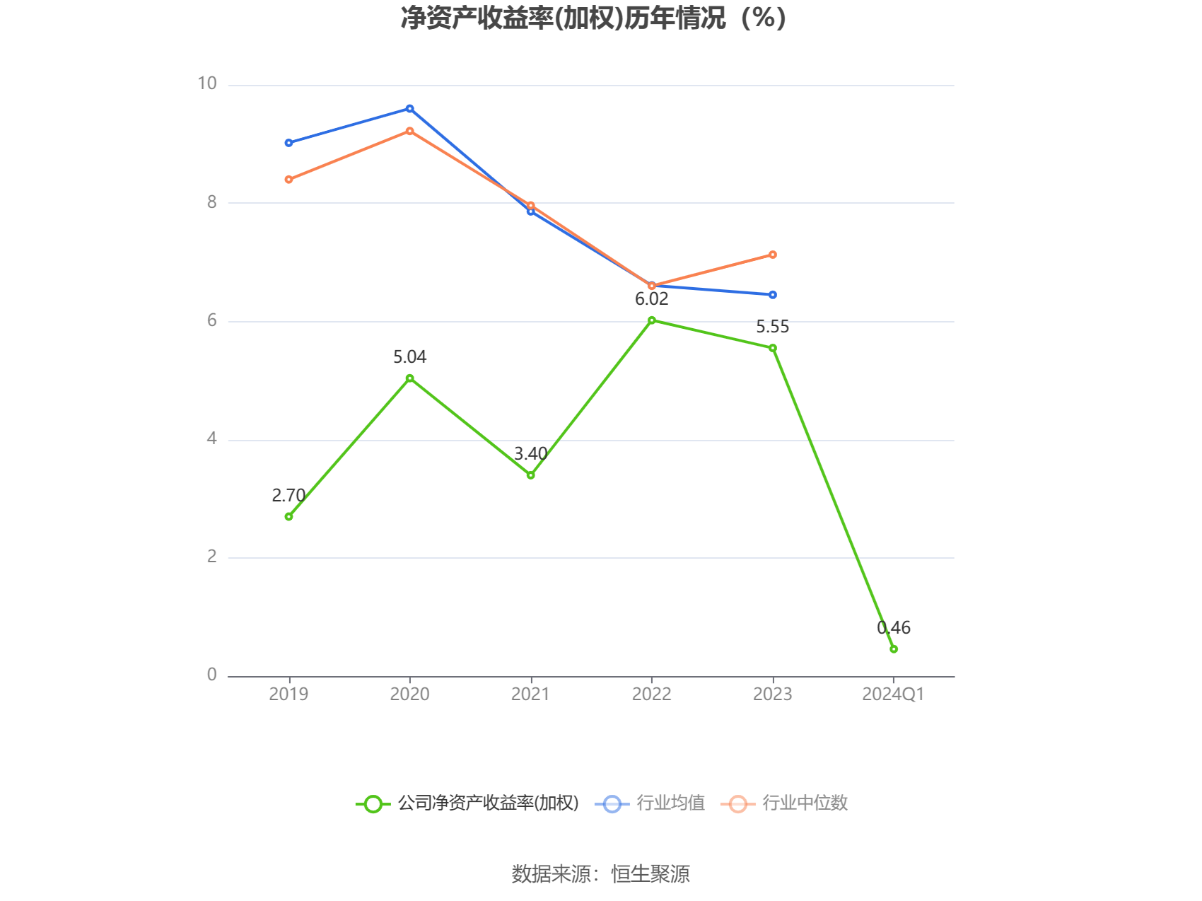 数据显示,2024年第一季度公司加权平均净资产收益率为0.46%,较上年同期下降1.60个百分点;公司2024年第一季度投入资本回报率为0.49%,较上年同期下降1.12个百分点。