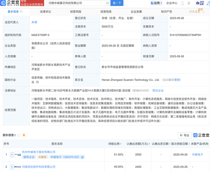企查查APP显示,近日,河南中威算芯科技有限公司成立,注册资本5000万元,经营范围包含:工业互联网数据服务;集成电路芯片及产品销售;集成电路销售;集成电路芯片设计及服务等。企查查股权穿透显示,该公司由中威电子(300270)等共同持股。