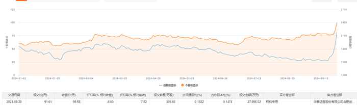 9月30日大宗交易成交305.6万股,成交额2.8亿元,占当日总成交额的4.39%,成交价91.61元,较市场收盘价99.58元折价8.0%。