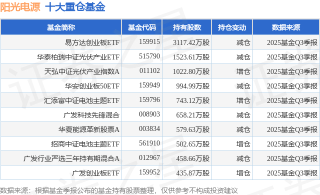 根据2025基金Q3季报公募基金重仓股数据,重仓该股的公募基金共561家,其中持有数量最多的公募基金为易方达基金的易方达创业板ETF。易方达创业板ETF目前规模为102.0亿元,最新净值3.1125(11月4日),较上一交易日下跌1.96%,近一年上涨45.15%。该公募基金现任基金经理为成曦 刘树荣。成曦在任的基金产品包括:易方达创业板ETF联接A,管理时间为2016年5月7日至今,期间收益率为52.69%;易方达深证100ETF,管理时间为2016年5月7日至今,期间收益率为85.75%;易方达上证科创板50成份ETF,管理时间为2020年9月28日至今,期间收益率为0.84%。刘树荣在任的基金产品包括:易方达深证100ETF联接A,管理时间为2017年7月18日至今,期间收益率为64.18%;易方达创业板ETF联接A,管理时间为2017年7月18日至今,期间收益率为89.57%;易方达深证100ETF,管理时间为2017年7月18日至今,期间收益率为63.98%;