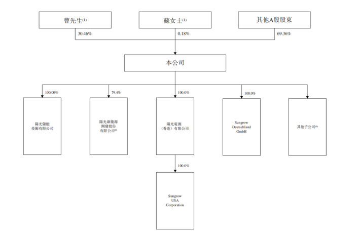 递表前,曹仁贤直接持有阳光电源30.46%股份;其妻子苏蕾持股0.18%,是曹仁贤的一致行动人,二人合计控制公司30.63%股权。