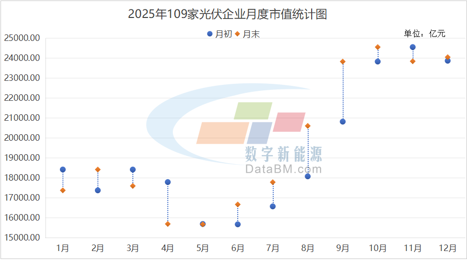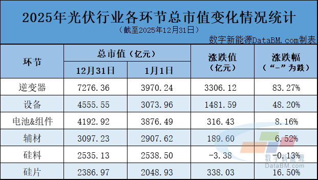 数字新能源DataBM.com统计了109家光伏上市企业2025年全年的市值变化情况,涉及硅料、硅片、电池、组件以及设备、逆变器、辅材等环节。