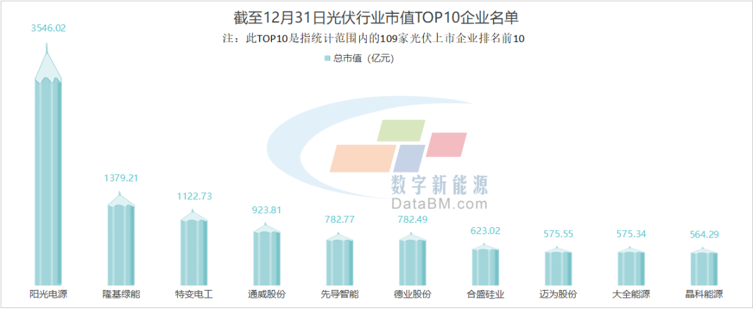 根据2025年12月31日市值情况排序,位居前10的企业分别是:阳光电源、隆基绿能、特变电工、通威股份、先导智能、德业股份、合盛硅业、迈为股份、大全能源以及晶科能源。