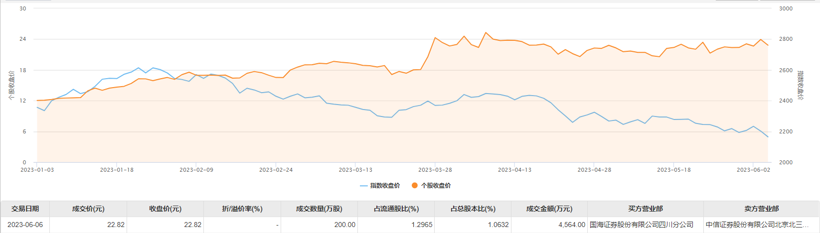 6月6日大宗交易成交200万股,成交额4564万元,占当日总成交额的20.26%,成交价22.82元,较市场收盘价22.82元持平。