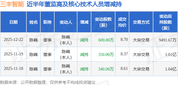 三丰智能:12月22日高管陈巍减持股份合计600万股