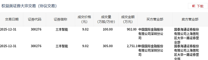 12月31日,三丰智能大宗交易成交405万股,成交额3653.1万元,占当日总成交额的5.19%,成交价9.02元,较市场收盘价9.7元折价7.01%。