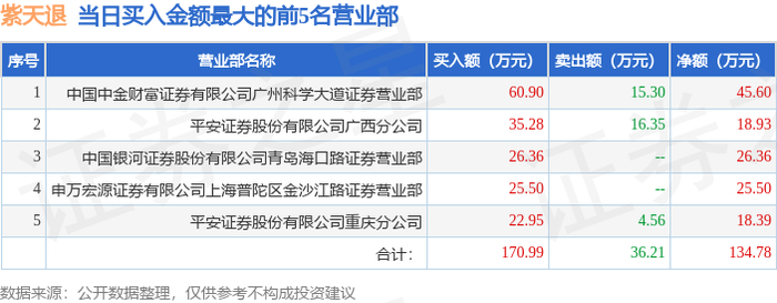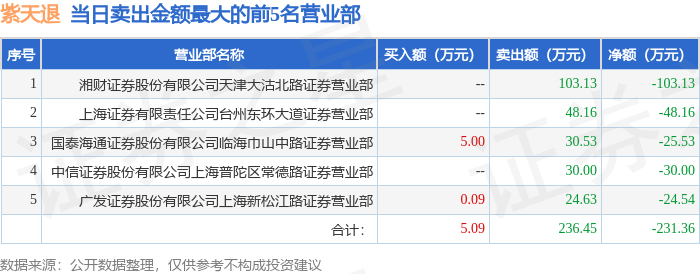 证券之星消息,沪深交易所2025年9月19日公布的交易公开信息显示,紫天退(300280)因退市整理期登上龙虎榜。此次是近5个交易日内第5次上榜。