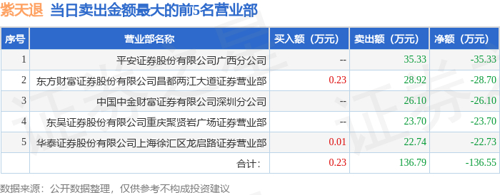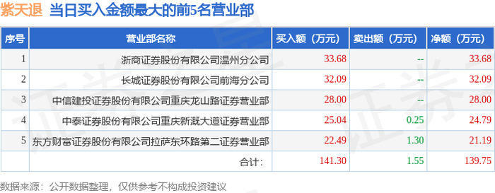 证券之星消息,沪深交易所2025年9月23日公布的交易公开信息显示,紫天退(300280)因退市整理期登上龙虎榜。此次是近5个交易日内第5次上榜。